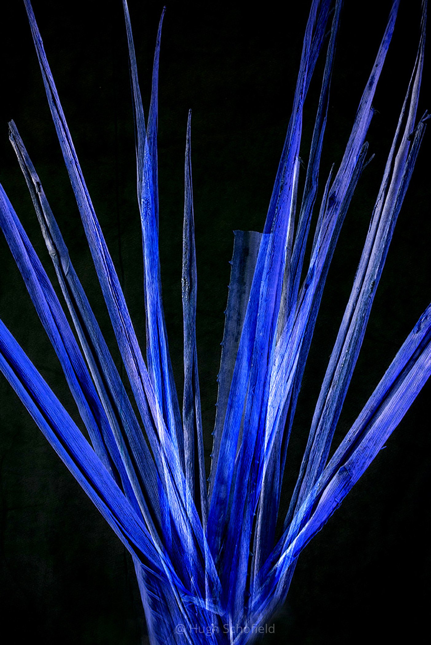 Sharp botanical blades rise from shadow, illuminated in deep, saturated blue. The composition feels almost abstract — vertical lines cutting through darkness with precision and power.
