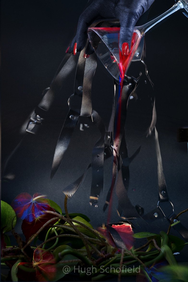A dramatic composition where deep shadows meet striking red accents. A gloved hand tilts a martini glass, releasing a vivid red liquid in a suspended moment of tension. Leather textures, metal hardware, and soft botanical elements create a powerful contrast between strength and fragility.