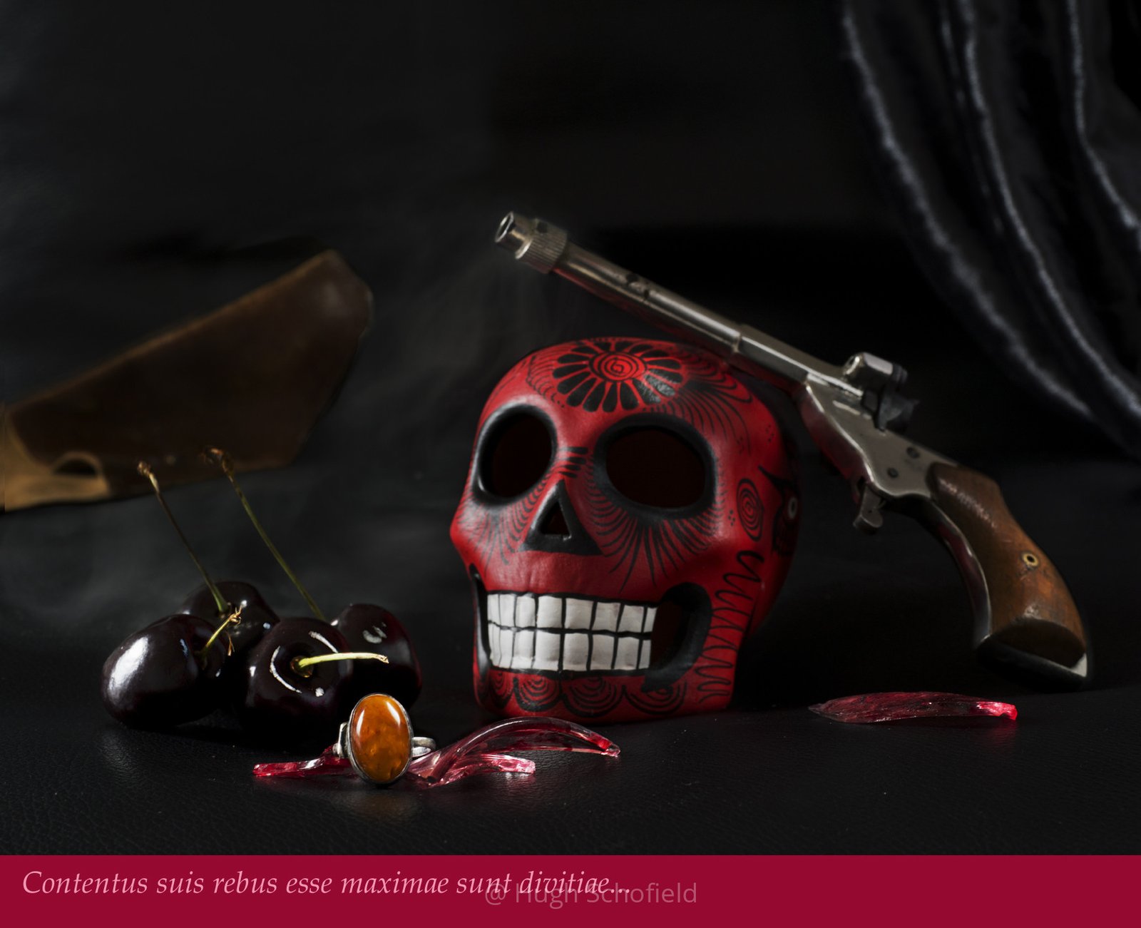 This striking contemporary still life blends symbolism and tension in a dramatic, shadow-filled composition. A vivid red skull sits at the center — bold, graphic, and almost ceremonial — surrounded by rich cherries, fractured glass, and metallic elements.
